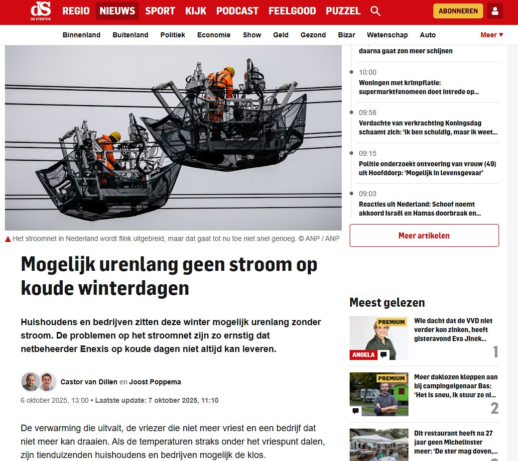 Volgens dit nieuwsbericht van De Stentor (06-10-25) bestaat de kans dat tijdens koude winterdagen het stroomnet het niet trekt, lange uitval is geen utopie meer.
